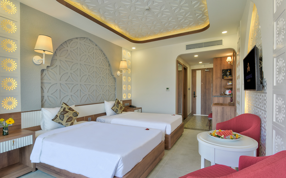 60 phòng ngủ được bố trí hài hòa trong các biệt thự và các khu nhà 3 tầng, tất cả đều có balcony mở ra sân vườn và hồ bơi, với diện tích bình quân 45m2/phòng với đầy đủ trang thiết bị, tiện nghi đẳng cấp 4 sao như TV truyền hình vệ tinh, điện thoại, điều hòa và máy nước nóng trung tâm, bàn viết, salon, bình nấu nước, máy sấy tóc, kimono, dép đi trong nhà…