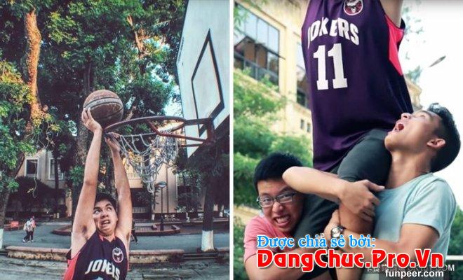 Để vươn người được đến rổ thực sự rất vất vả, đặc biệt là cho hai người bạn phải “vật vã” đỡ mình.